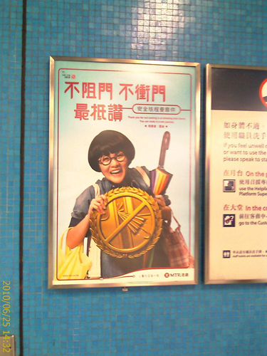 网友“暗香盈袖”将上海地铁与香港地铁作比,称香港地铁站台墙上、扶梯边上都树了好多类似的公益宣传图,屏蔽门下方也有类似文字告示。图片来源:宽带山