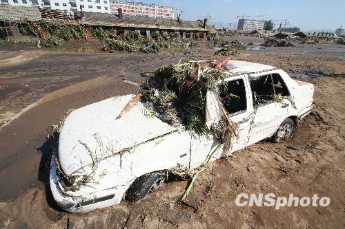 7月29日,吉林省永吉县洪水基本消退。7月28日,吉林永吉县遭遇百年不遇特大洪水袭击,县城口前镇部分地区水深达到5米,一些平房被冲倒,居民财产受到严重损失,农民庄稼被水淹没造成绝收。部分道路桥梁被毁,一些车辆被洪水冲走或被掀翻。 中新社发 崔毅 摄