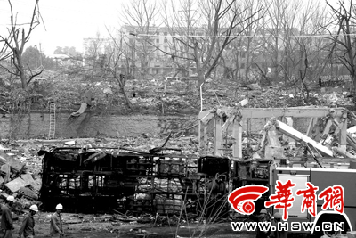 公交车被烧成空架子,背后是爆炸前已被拆除的建筑物