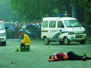 疑犯被制服 据网友称疑犯杀人后坐在现场喝酒