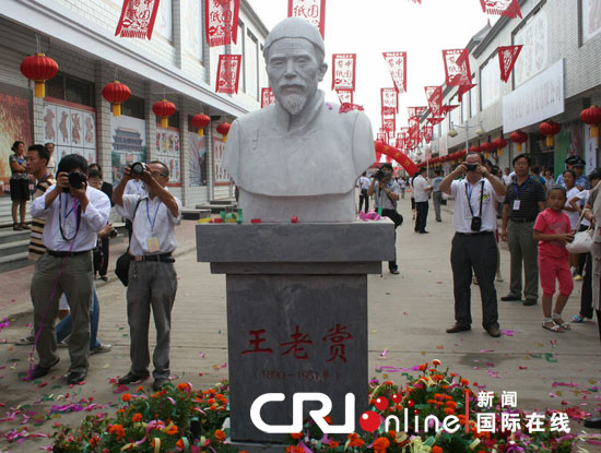 剪纸一条街门口,是蔚县剪纸一代宗师王老赏的雕像 苗慧摄