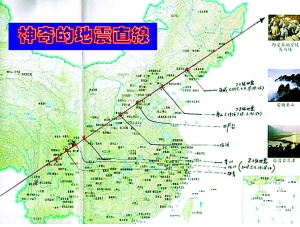“震惊发现!大地震区竟然成一条直线横跨中国”这个帖子,让网友们惶恐,也引起了地震专家们的关注。帖子说:一天晚上,我的父亲突然拿了一本《中国地图册》,兴冲冲地告诉我,“你看中国4次大地震的位置在一条直线上”,我一看很惊奇,辽宁的海城大地震、河北的唐山大地震、邢台大地震、四川的汶川大地震竟然能连成一条直线。这是一个新发现,还是巧合?于是我立即收集中国地震历史,发现中国地震史上的重大地震基本都在这条直线上。1303年山西赵城大地震,1037年河南京师(洛阳)大地震,1555年陕西渭州、华州及山西蒲州大地震,1695年的山西临汾大地震,1654年的陕西西安、延安地区大地震,1996年云南丽江大地震等等基本上都在这一条直线上。从辽宁的海城大地震区连线一直到云南的丽江地震区,其所经过的省市基本都有伤亡极大的重大强烈地震。