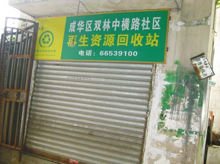 这个再生资源回收站位于大门口,是一间约10平方米大小的屋子。卷帘门紧闭着,上面布满了灰,而“某社区再生资源回收站”的字样很醒目。拨通招牌上所留电话,一女子说,这是居委会。社区主任表示,那个房子成了仓库,没用起来。