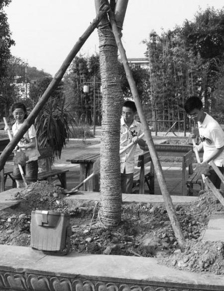 华西都市报讯(记者汪仁洪摄影报道)昨日上午8时许,今年高考四川省文科第一名向昊天、遂宁市文科第一名袁睿琦、理科第一名杨佳来到遂宁市广德景区,培植“学校树”(右图),为家乡学子祈福。
