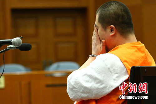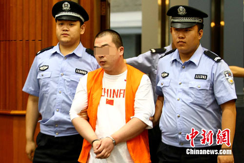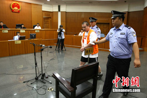 8月12日,北京大兴李磊灭门案在北京市第一中级人民法院公开审理。该案原定上周三开庭,但因李磊突发阑尾炎而改期。2009年11月23日晚,李磊将父母、妻子、妹妹和两个儿子共计六人杀害。图为犯罪嫌疑人李磊(中)被法警带入法庭。