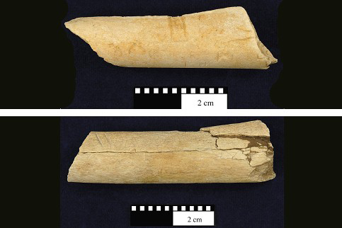 这两块骨化石分别来自动物的肋骨和大腿骨。上面的凹痕显示,当时的人类曾用它剔、砍和切肉。骨刀中还发现夹有石片,可能是用于增加骨刀的锋利度。