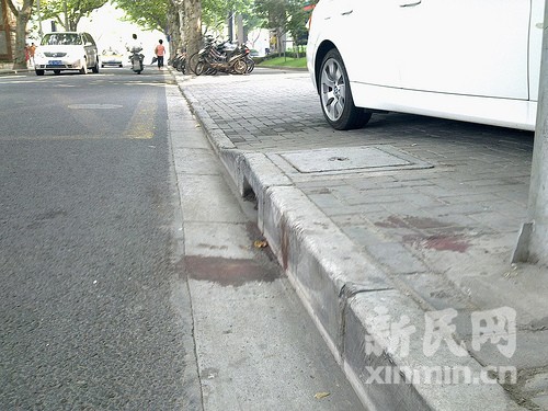 事发现场还残留着血迹。新民网记者萧君玮 汾阳路淮海路路口回传