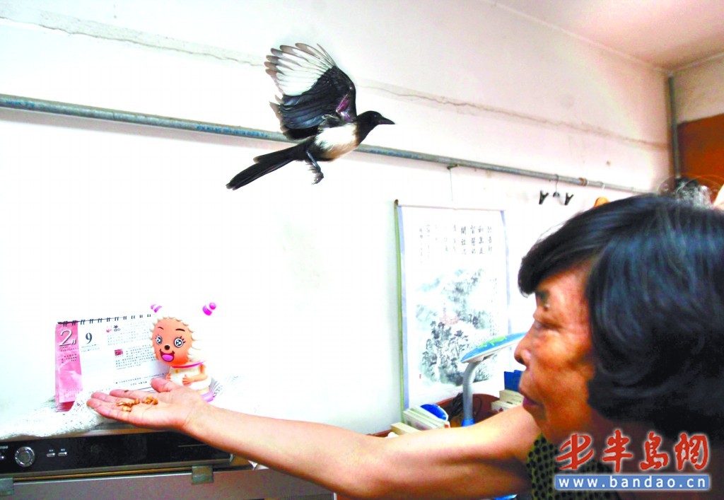 半岛都市报8月13日讯(记者 孙倩陈界交)8月13日上午10时许,大沽路的张女士家开着窗,一只喜鹊飞了进来,落在桌子上啄食。完全没把自己当外人。吃饱喝足玩尽兴后,它还缠着女主人陪它玩耍 ,逗得张女士和邻居开心不已。