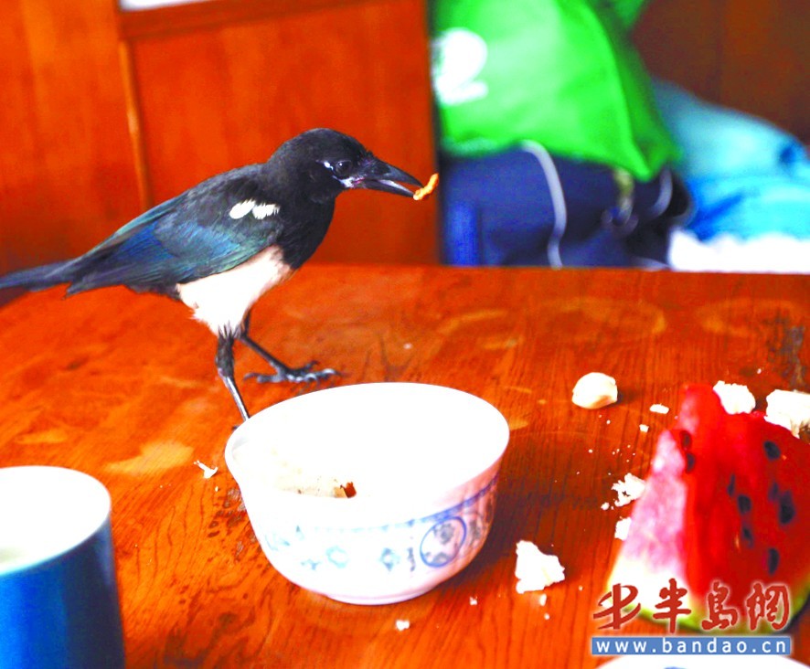 “我们邻居家飞进一只小喜鹊,把餐桌上的肉、西瓜和馒头啄了个遍,不仅不怕人,还特别喜欢有人逗它玩,在邻居家里赖着不走了。”13日下午4时许,大沽路26号的市民姜先生给本报打电话反映。