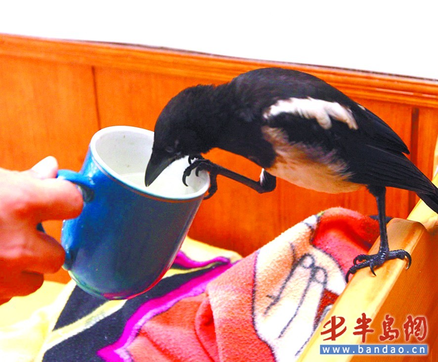 记者伸手摸摸小喜鹊的头,它一点也不畏惧,反而开心地张大了嘴巴。记者将装满水的水杯递给它,它一点也不客气,一只爪子放在杯子上,摇头晃脑地喝起了水,水滴都溅了起来。