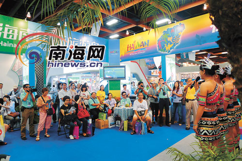以“阳光海南,度假天堂”为主题的海南展馆面积接近150平方米,重点宣传推介海南国际旅游岛建设的新形象,并打出“在世界行走,为海南停留”的旅游宣传语。全开放的展馆,大幅颇具冲击力的彩色图片全方位展现了海南滨海度假、温泉养生、热带雨林等特色旅游产品,一开馆就吸引了两岸业界朋友的目光。