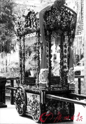 “在八音班,不得不提锣鼓柜”,据介绍,在珠江三角洲地区,民间喜庆历来有演奏锣鼓吹打乐的习俗,因而在清康熙年间在珠江三角洲广大农村,兴起了一种名为锣鼓柜的对粤曲形成曲种产生过一定影响的音乐班子。在“八音班”时期,艺人经常是推着锣鼓柜走街串巷,演唱卖艺,成为当时民间一道亮丽风景,保存至今、仍然完整的锣鼓柜已不多。锣鼓柜必有一个摆放锣和鼓等敲击乐器的木制柜子为标志,柜为长方形,制作精美,长约四尺,宽二尺,高四尺,有基、柱和檐,但无盖;锣鼓柜表演粤曲唱腔不用人唱,而用大唢呐吹奏男腔,小唢呐吹奏女腔,其他乐器担任拍和。