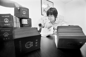 昨天下午,记者在朝阳区婚姻登记中心的工作室内看到,为了能在七夕当天加快新人领证的速度,一名工作人员正在快速而又准确地给成摞的结婚证书上加盖“北京市朝阳民政局婚姻登记专用章”。