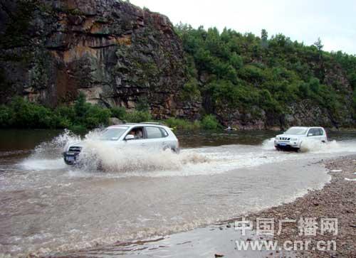 没有下水漂流的车友们,开始在浅滩中尝试驾车在水中劈波斩浪的游戏。只见一辆一辆的越野车,在浅滩的水中疾驰而过,顿时,车的四周飞起一人多高的白色水花,煞是好看。车友们开心欢快的笑声在雅鲁河的两岸久久回荡。下了小半天的雨,也奇怪地随着人们的欢笑而云开雾散。