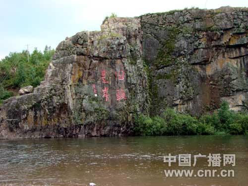 毕竟是在岸上驾车,车队仅仅用了不到20分钟的时间,就来到了漂流需一小时左右的雅鲁河终点。漂流终点的水面极为宽阔,水流也很平缓。岩壁上刻有“回头是岸”四个鲜红的大字。在河岸一边,与岩壁题字相对的是一座雕梁画栋的“上岸亭”。