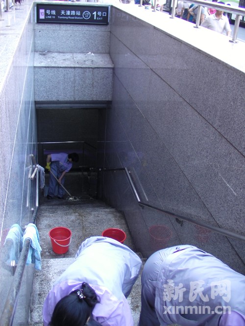 天潼路站1号口附近,清洁工正在清洁台阶。新民网记者陆俊彦 河南北路现场回传