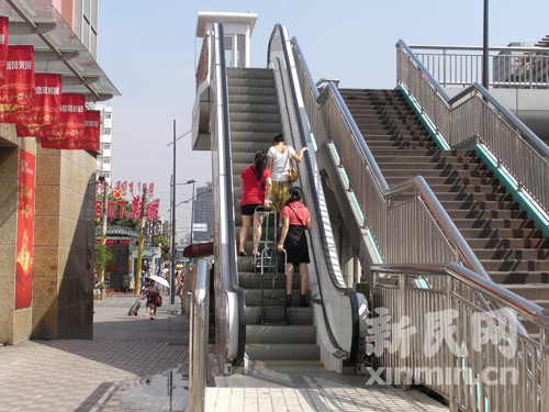 10号线天潼路站附近长期停运的七浦路人行天桥自动扶梯也修好了。新民网记者陆俊彦 河南北路现场回传