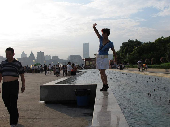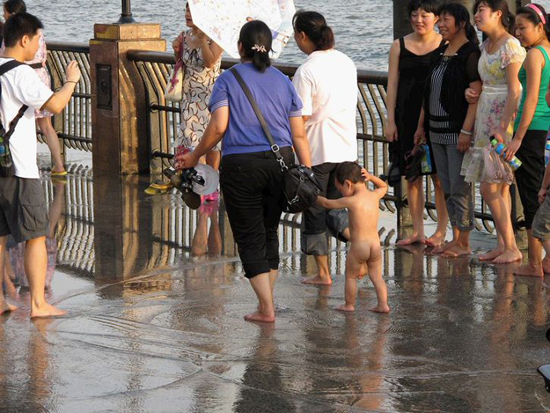 从图片中看,踏上草坪照相者有之,以栏杆当座椅者有之,乱扔垃圾者亦有之,甚至有不少小朋友全身裸露在浦东滨江大道戏水。不少网友表示,游览过外滩后发现“人实在太多”,而对于那些爬上临江栏杆的行为,有网友认为是“不要命的”。小朋友裸体戏水图引来网友围观,认为虽充满童趣,但实在不甚雅观。(新民网 袁蓉)
