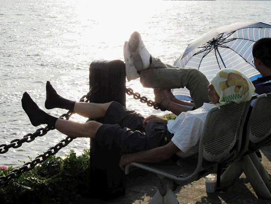 游客在滨江大道休憩,跷起二郎腿。图片来源:天涯论坛