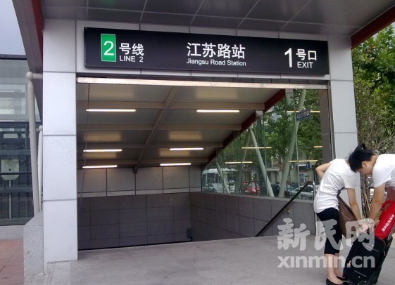 地铁2号线江苏路站的1号出口白天亮灯 。新民网记者许亮多 2号线江苏路站现场回传