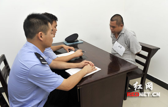 长沙公安民警正在对犯罪嫌疑人进行审讯