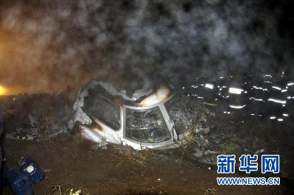 8月25日凌晨,救援人员在失事飞机残骸边开展救援工作。新华社发(李广福 摄)