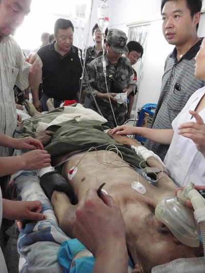 8月10日13时,卫生部应急办公室主任梁万年(左二)组织指挥北京天坛医院神经外科中心副主任医师曹勇(右一)等专家救治被埋58小时的伤员。