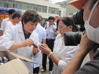 8月16日9时,北京中医医院院长王莒生(左一)向灾区群众发放本院内部制剂甘草油,并讲解使用方法。