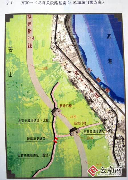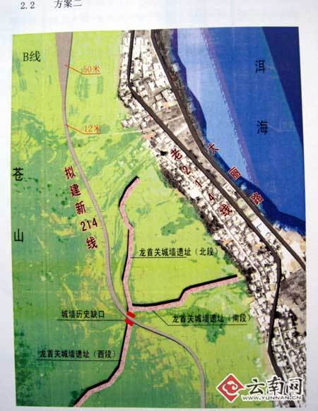 “龙首关是苍山与洱海之间最窄的地方。龙首城为东西走向,214国道为南北走向,无论采取何种方案,都必须要从龙首城遗址上经过。”大理州博物馆原馆长谢道辛说,通过考古发掘,西部为南诏大理国时期遗址,东部为明代遗址。两害相权求其轻,在按照文物保护最小干预原则,还是走中间这个位置为妥(即第一方案)。
