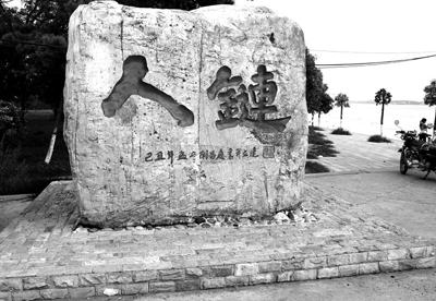 宝塔湾立了“人链”字样的碑,以纪念去年救人英勇牺牲的三名大学生