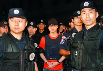 台中市警局昨晚把枪杀翁奇楠的主嫌廖国豪(中穿红衣防弹背心者),移送少年法庭收容。(图片来源:台湾《联合报》)
