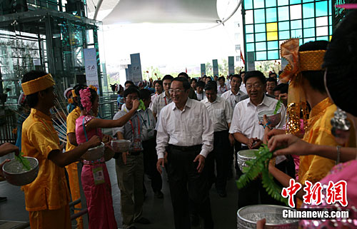 8月27日,上海世博会云南活动周正式拉开帷幕。中共中央政治局委员、上海市委书记、上海世博会组委会第一副主任、上海世博会执委会主任俞正声(左)与中共云南省委书记白恩培(右)一起出席上海世博会云南活动周开幕式。图为,俞正声和白恩培接受来自云南傣族的泼水祝福。
