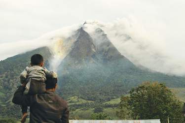 8月29日,一名男子与孩子观看锡纳朋火山喷发