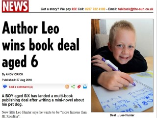 报道称,6岁的小朋友应该每天都无忧无虑,处在玩扮家家酒的阶段才对,但在英国却有一名小男童──李奥亨特(Leo Hunter),年仅6岁就已经是一位拥有出版合约的儿童故事作家;被媒体号称为“儿童狄更斯”的李奥表示,他未来要以JK?罗琳(Joanne Kathleen Rowling)为目标。