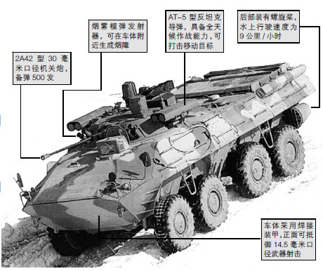 其实以色列方面的担心纯属多余,因为此次俄罗斯提供的BTR-70 已是该系列战车中较为老旧的型号,战斗力十分有限。在目前的BTR 家族中,BTR-90 才是令人生畏的“装甲骑兵”。作为BTR系列中战斗力最强的型号,BTR-90车长7.6米,宽3. 2 米,重约20 吨,由3 名车组成员驾驶,可搭载9 名士兵,具有两栖作战能力。(何西)
