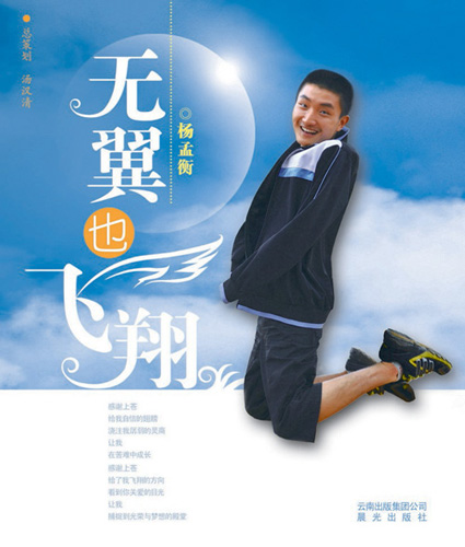 “在机场遇到他时,他一个人,背上居然背着一个大大的旅行箱,一脸灿烂的笑容。”晨光出版社的段丽彬副社长说,今年8月初,当杨孟衡的父母告诉她打算给儿子出一本书时,她决定跟这个无臂少年见一面。当时,杨孟衡一个人从广州回到昆明,见到他那一瞬间,段丽彬竟被他的笑容所感染。《无翼也飞翔》很快付梓,“算是送给他考上大学的一份礼物,也是给我们每个少年的激励和教育。”段丽彬说。