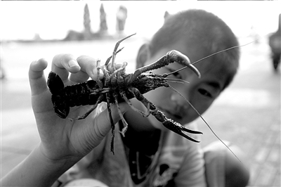 | 在湖北省襄樊市区,一个小朋友展示一只小龙虾。新华社发 |
