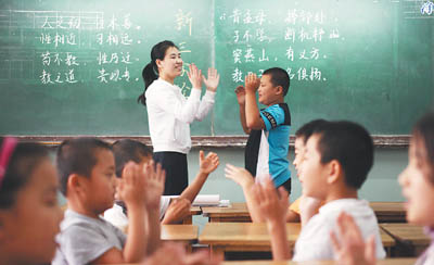 哈尔滨海城小学老师在新三字经课堂上与学生们互动。位于城市中心区的这所学校近八成学生是外来务工人员子女。