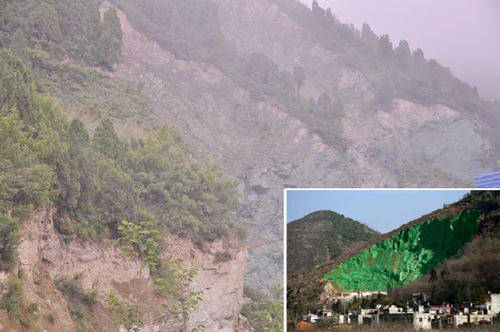 在华县杏林镇宫里村附近的华胜石碴场,有一条运送石料的山路通往山里面。记者在山路口看到,一大片采石毁坏的山体呈现出异样的绿色,仔细查看,原来是山石刷上了绿漆,面积有上千平方米。据附近村民介绍,绿漆是最近专门喷涂上的,目的是为了让光秃秃的山崖好看一些。与此相同的是,在华县少华山景区入口处,也有一处采石留下的印迹喷过绿漆。