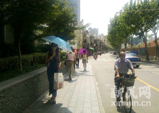 申城今日蓝天白云,室外稍嫌闷热,徐家汇最高温止于33.3℃。新民网 袁蓉 茂名北路现场回传