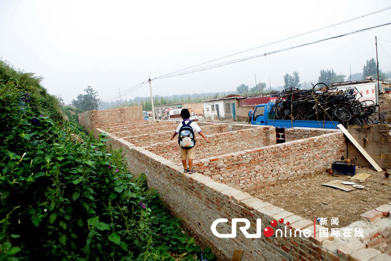 2010年9月6日清晨,一名上学的小孩在房屋围墙上行走。