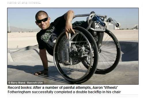 如今,艾伦又在宾夕法尼亚州(Pennsylvania)打破纪录,以一条弹性绳索高速冲上斜坡,再利用其上身的力量,进行两圈高速旋转,之后让轮椅完美着地。对此,艾伦表示,“我和别人并没有什么不同,我们做同样的技巧和动作,只不过我是坐在轮椅上而已。”