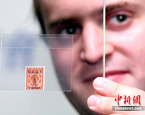 香港苏黎世亚洲将于9月11至13日在香港怡东酒店举行“中国、香港、亚洲及其他国家邮票和邮政史秋季拍卖”,呈献超过2300件总估值逾2000万港元之珍稀亚洲邮品。9日,在记者会上展示拍卖焦点,一枚罕有的1897年清朝红印花壹圆邮票(估价250万至300万港元),颜色鲜艳,属新票,原胶上品,保存完好,是存世同类邮票中最完美的其中一枚,被认为华邮中之极品。中新社发 洪少葵 摄