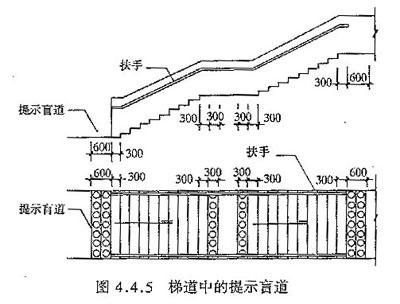 4.4.2 人行天桥、人行地道的坡道应适合乘轮椅者通行;梯道应适合拄拐杖者及老年人通行。在坡道和梯道两侧应设扶手。