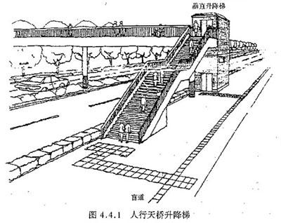 4.4.1 城市中心、商业区、居住区及公共建筑设置的人行天桥与人行地道,应设坡道和提示盲道;当设坡道有困难时可设垂直升降梯 (图4.4.1)。