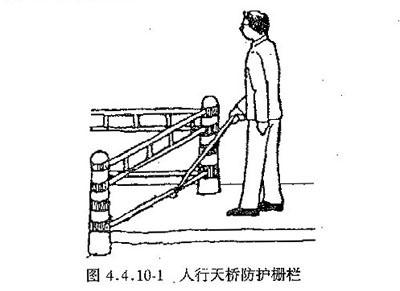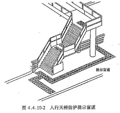 4.4.10 人行天桥下面的三角空间区,在2 m高度以下应安装防护栏,并应在结构边缘外设宽0.30~0.60 m提示盲道 (图4.4.10-1, 图4.4.10-2)。
