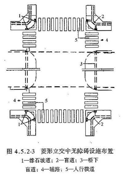 4.5.2 立体交叉人行道的缘石坡道、人行横道及盲道的位置应相互对应和衔接(图4.5.2-1, 图4.5.2-2, 图4.5.2-3)。