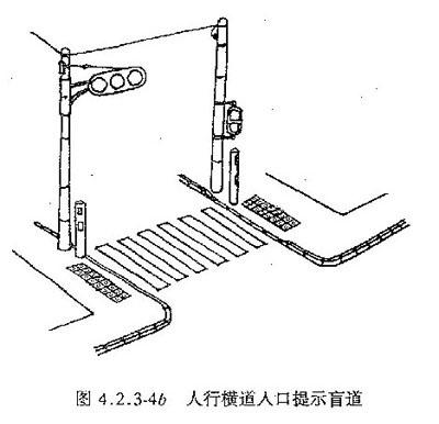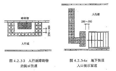 4 距人行横道入口、广场入口、地下铁道入口等0.25~0.50 m处应设提示盲道,提示盲道长度与各入口的宽度应相对应 (图4.2.3-4a, 图4.2.3-4b);