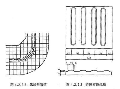 2 指行残疾者向前行走的盲道应为条形的行进盲道(图4.2.1-1);在行进盲道的起点、终点及拐弯处应设圆点形的提示盲道 (图4.2.1-2);