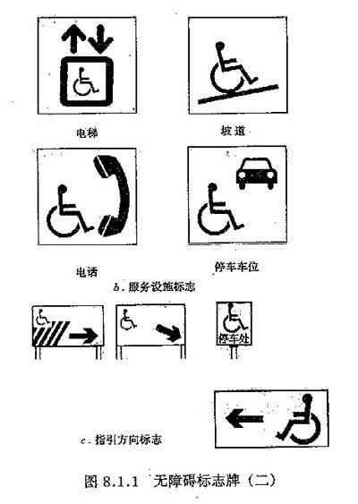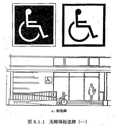 8.1.1 政府机关与主要公共建筑的无障碍通路、停车车位、建筑入口、服务台、电梯、公共厕所或专用厕所、轮椅席、客房等无障碍设施的位置及走向,应设国际通用的无障碍标志牌(图8.8.1)。